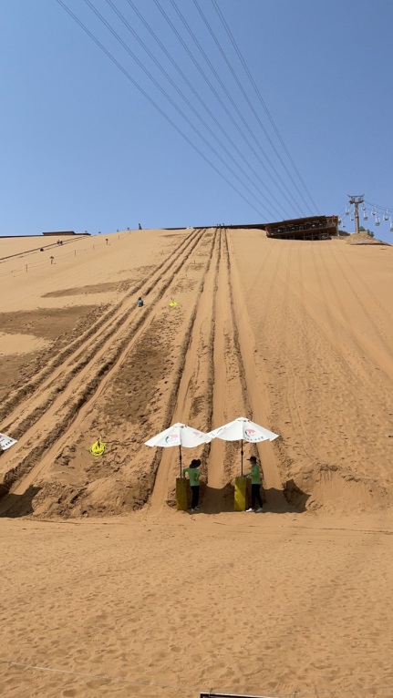 沙坡头有中国最大的天然滑沙场,滑沙后,坐缆车回,再体验横跨黄河的“天下黄河第一索”,恐高的同事也超越自我,体验了一把水上高空飞翔的感觉。脚下是腾格里沙漠的始发地,对面就是黄河,“飞黄腾达”名副其实。