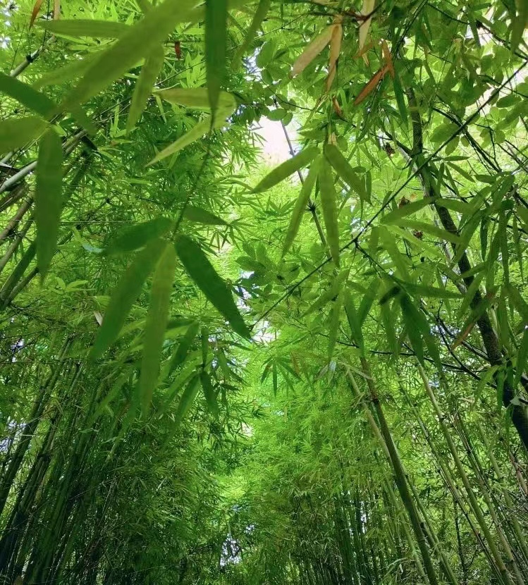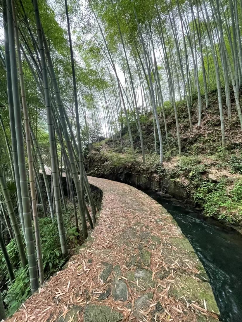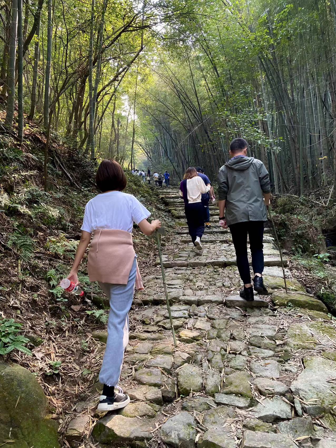日铸岭古道开始时便有上坡,坡度陡峭,不知道谁从竹林里找来了半人高的竹竿,分给了体力不足的女同事,但是即使有了这把与众不同的“登山杖”的帮助,大家来到第一个山头的时候,还是气喘吁吁,汗流浃背。大家互相传递着纸巾擦汗,不一会同事带着的大包纸巾就见底了。抬起头看从斑驳的树叶里透出的阳光,恍惚间让人觉得好像太阳变成了碎片,一片片散落在了这片竹林里。短短的长椅上,大家互相倚靠在一起,上气不接下气地打着趣,仿佛一大家子刚结束一天劳累农活的佃户,竹林里充满了快乐的气息,甚至大树都笑弯了腰。