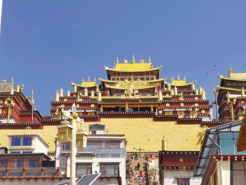 晚餐过后,大家在独克宗古城漫步,看到了世界上最大的转经筒,伴着龟山公园的桃花和无处不在的经幡,一路的疲惫和不适也逐渐都烟消云散。次日,驱车前往此次的第二个景点素有小布达拉宫之称的葛丹松赞林寺,寺庙金顶磅礴壮丽,怀着一颗虔诚的心,步上长长的阶梯,在浓厚的藏传佛教氛围下看到了令人叹为观止的藏式建筑。