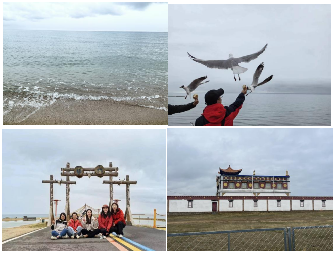 初晨还下着蒙蒙细雨,大家乘坐小火车沿途欣赏青海湖畔的美景,伴着清新的泥土草气,牛羊成群在左,青海湖悠悠浪声在右,伙伴们都不乏沉沦于此。