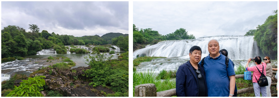 远观,黄果树瀑布从斜坡上直泻下来,如雷声轰鸣,山谷回应。而当我们登上瀑布中段,进入到瀑布后的水帘洞中,又是另一种奇妙的感受。只见水帘漫顶而下,我们隔着玉洁晶莹的飞瀑水流向外眺望,瀑布对面的青山、绿树、游人,若隐若现,真如置身于仙境之中呀!