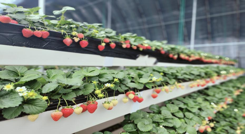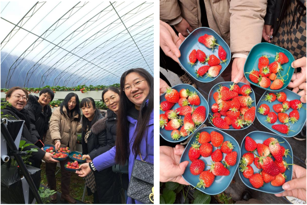 午餐过后,大家便来到了草莓园。一颗颗鲜红欲滴的草莓掩映在绿叶间,散发着诱人的香气。经过讲解员的介绍,让我们了解了草莓的起源、品种、种植技术以及营养价值等知识。大家手拿小盘,穿梭在田垄间,小心翼翼地边采摘边品尝着可口的草莓,感受着田园生活的乐趣,脸上洋溢着幸福的笑容。大家对草莓有了更深入的了解,也感受到了现代农业科技的魅力。