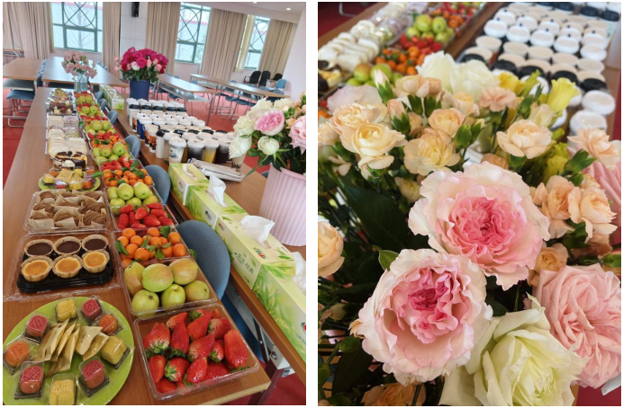 活动当日,公司的会议室摇身一变成了下午茶天地。桌上整齐摆放着奶茶、蛋糕、水果拼盘,还有一束束鲜花,红玫瑰热烈奔放,粉玫瑰清新淡雅,康乃馨温馨美好,每一朵花都承载着公司对女员工们满满的祝福。